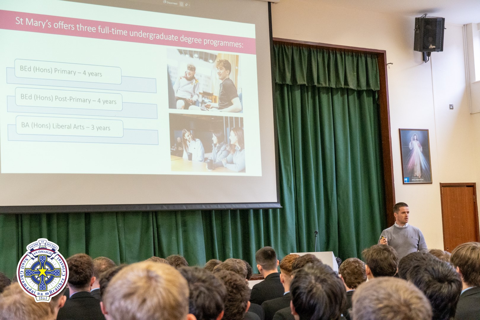 We would like to thank Damian Ball for speaking to our Year 13 students about the opportunities available at St Mary’s University College, Belfast. The talk included information on the three degree programmes they offer with specialisms in a range of different subjects.